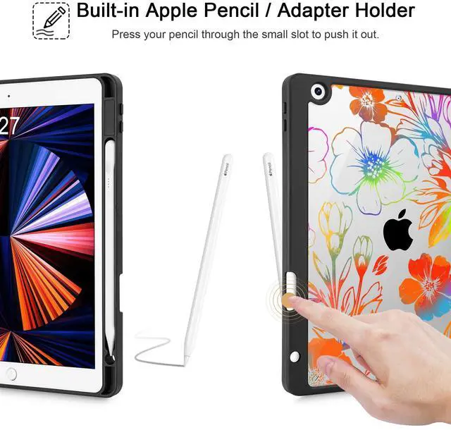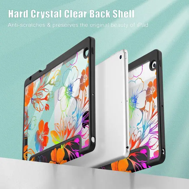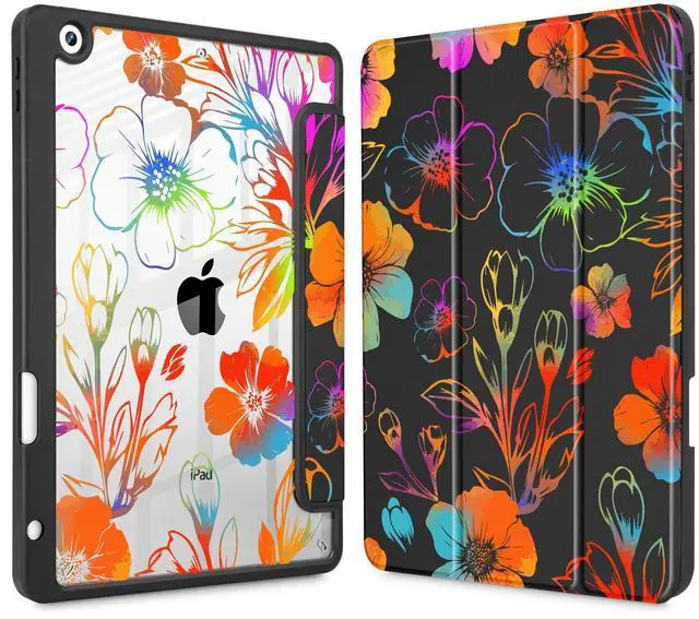Tuiklol for iPad 10.2 case 2021 Gen 9th Release Built in Pencil Holder - Trifold Stand-Auto Wake/Sleep TPU Protection Stand Clear Back Cover for 2020 2019 [8th/7th] iPad 10.2 Case,Color Flower Black