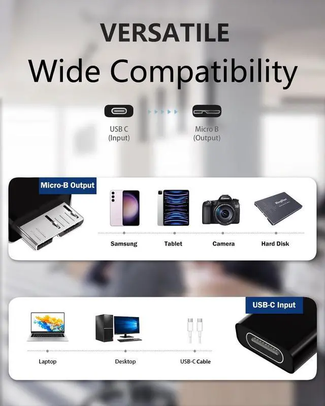 Better office and leisure experience. ^^ Easy to UsePlug and play, no driver required. It is well fit snugly on both ends and offers a firm connection between the portable external hard drive and your laptop, which greatly ensures stable and fast data transmission. Simple structure, lightweight and portability, can be carried around without taking up much space. ^^ Friendly Design ShineeKee USB C to Micro B Adapter designed to connect your old portable external hard drives compatible with your new USB C or Thunderbolt 3 desktop/laptop/tablet directly, which helps reduce the number of cables that you need to carry around with you.