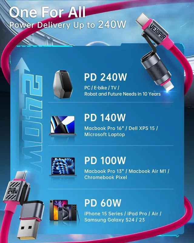 [Notice] Please note you are purchasing a 240W version now, we also have 45W, 60W, 100W, 180W and 140W versions for you to choose from. Please make sure you are buying right cable before confirming order! ^^ [4-in-1 Multi Charging Cord for All Devices] Simplify your charging setup with our versatile 4-in-1 usb-c cable. It combines 4 ports - USB-C to L, USB-C to USB-C, USB-A to USB-C and USB-A to L, - into one cable. Providing a comprehensive solution for your fast charging and data transfer needs.