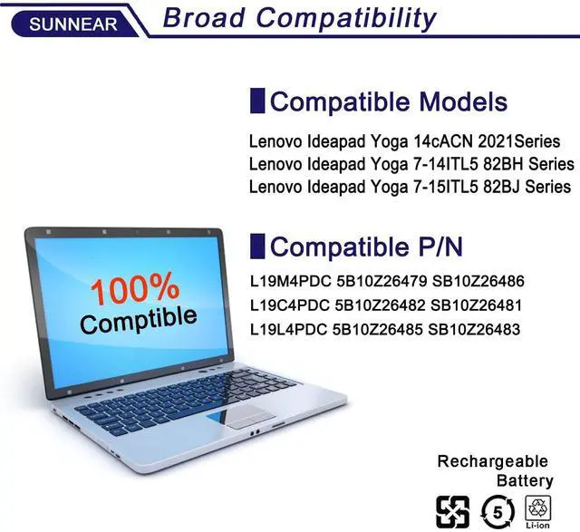 Battery type: Li-ion. Also comes with installation tools ^^ Compatible Laptop/Notebook Models for Replacement for Lenovo Ideapad Yoga 14cACN 2021Series Notebook. for Lenovo Ideapad Yoga 7-14ITL5 82BH Series Notebook. for Lenovo Ideapad Yoga 7-15ITL5 82BJ Series Notebook ^^ Compatible Part Number L19M4PDC 5B10Z26479 SB10Z26486 L19C4PDC 5B10Z26482 SB10Z26481 L19L4PDC 5B10Z26485 SB10Z26483 ^^