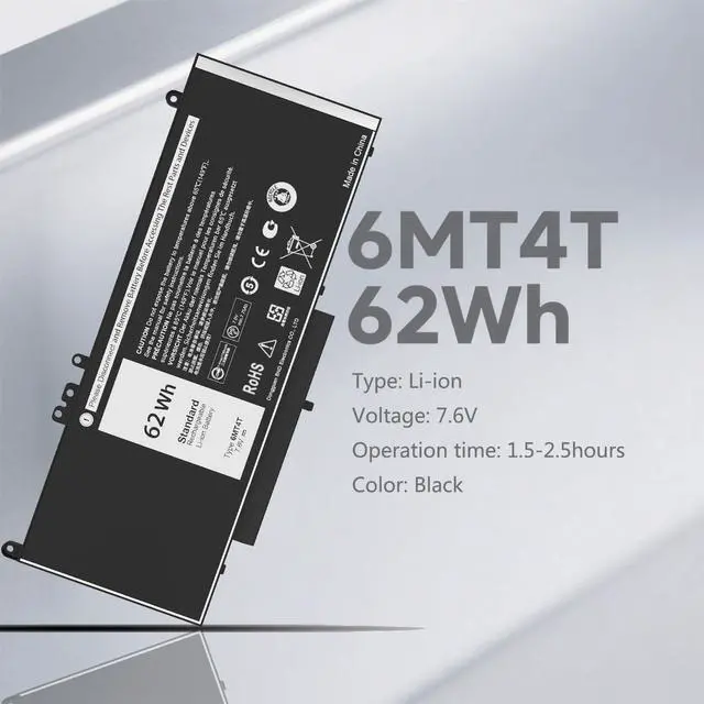 SpecificationItem Model: 6MT4T; Product Type: Replacement battery; Number of Cells: 4 Cell; Voltage: 7.6V; Capacity: 62Wh; Battery Life: Up to 500 recharge cycles over the life of the battery.Condition: 100% New; 100% Original Compatible