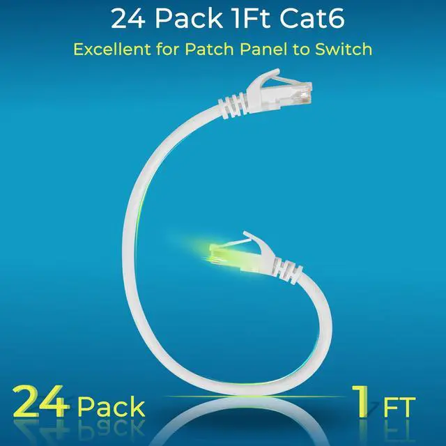 24 Pack24-pack of CAT6 patch cables with short length is excellent solution for connecting patch panel to switch and other various devices in high performance. Available in various colors and length of cable patch cords. ^^ Save TimeThis premium ethernet cable save hours of time and hassle of cutting and crimping custom length cables for patch panels. Don't waste time on hand-making rj45 Internet cable. ^^ 10G speed via Gold plated pins All 8P8C of cat 6 patch cable are golden plated to support better network connection up to 10G speed 550MHZ ethernet network. This is a well pre-made 1ft cat6 patch cable with 26AWG stranded pure copper and can be used as cat6a patch cable to upgrade cat6a network.
