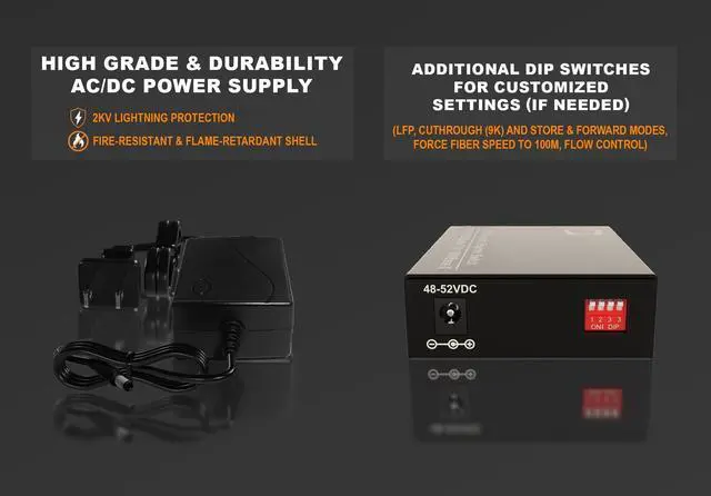 Additional DIP switch settings make it easy to enable/disable the LFP function, toggle between Cuthrough (9K) and Store & Forward Modes, Force fiber speed to 100Mbit/s, or enable/disable Flow Control. ^^ [ 2 port High-Speed Transmission] - Experience fast data transfer rates with our gigabit PoE media converter, which is ideal for high-bandwidth applications and ensures minimal latency in your surveillance or VoIP network communications. ^^ [ Durable and Reliable] - Designed for longevity and reliability, our fiber ethernet converter PoE is built to withstand the demands of professional environments, ensuring a stable connection for your critical network devices.
