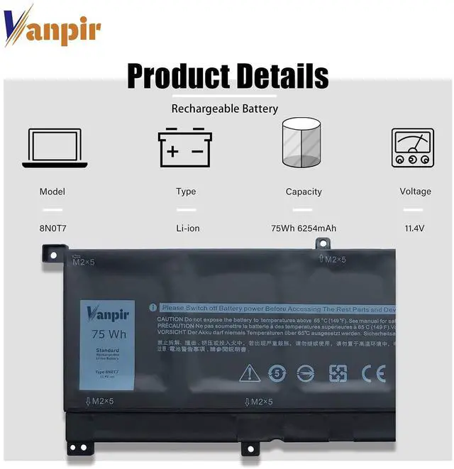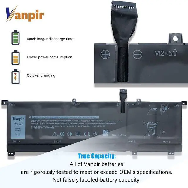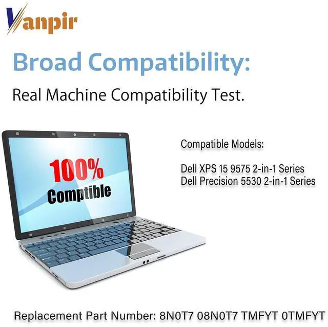Capacity: 75Wh 6254mAh 6-Cell. Up to 1000 recharge cycles over the life of the battery. Brand New Grade A cell battery, all Vanpir batteries are certified by UL / CE / FCC / RoHS for safety ^^ Compatible Laptop ModelsFor Dell XPS 15 9575, Dell XPS 15 9575 2-in-1, Dell XPS 15-9575-D1605TS Series, Dell XPS 15-9575-D1805TS Series, Dell XPS 15-9575-D2605TS Series, Dell XPS 15-9575-D2601TS Series, Dell XPS 15-9575-D2805TS Series, Dell XPS 15-9575-D2801TS Series, Dell XPS 15 9575 i5-8305G Series, Dell XPS 15 9575 i7-8705G Series, Dell Precision 5530 2-in-1 Series. ^^ Replace Part Number8N0T7, 08N0T7, TMFYT, 0TMFYT ^^ Matters Need AttentionBefore purchasing, please open your laptop case, check and confirm your original battery model and appearance, compared with our battery image, make sure that's what you need. Especially the location of the connector and the cable length (long or short) ^^ Quality AssuranceSupport 30 days return or exchange and 12 months replacement. Factory Sealed, Retail Packaged. Any questions will be answered within 24 hours, Serve you wholeheartedly.