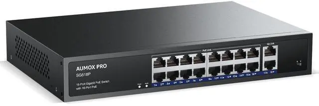While 17-18 ports can communicate to each other port. Effectively suppress network faults such as network storms, ensuring good network transmission performance and security ^^ Metal caseAUMOX PRO 16 port PoE switch is protected by high-quality metal casing to ensure a long product life. Having passed an array of stringent reliability tests, AUMOX PRO switch delivers switching performance you can depend on ^^ Multiple installation options Supports desktop, wall or rack placement, and the 19-inch length conforms to more switch racks ^^ Wide ApplicationsAUMOX PRO ethernet switch can connect PoE and non-POE devices, such as IP cameras, Access Point, Computer Networks devices, etc ^^ After-sales serviceEvery AUMOX PRO PoE switch is rigorously tested for reliability, quality, and performance.