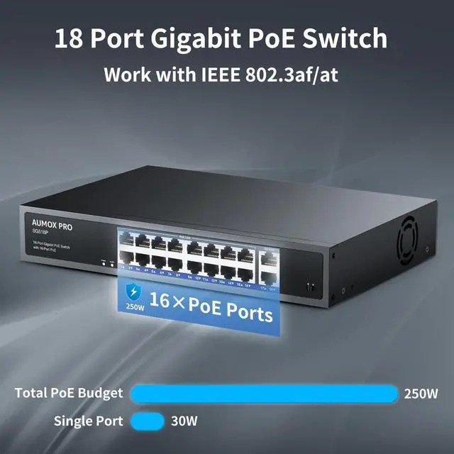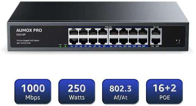 18 Gigabit PortAUMOX PRO ethernet switch includes 16* 10/100/1000Mbps RJ45 PoE ports with 2 Uplink gigabit ports. Excellent data transmission performance ^^ 250W poe switchAUMOX PRO network switch equipped with 16* 802.3 af/at PoE ports with up to 30W for each port, data, and power can be transferred on one single cable. It supports PoE power up to 250W for all PoE ports ^^ Plug And PlayAUMOX PRO 18 unmanaged poe switch just plug in the power cord and network cable, no configuration required, easy to use ^^ Built in industrial-grade fansPowerful industrial-grade fans for better heat dissipation while effectively reducing noise, enabling longer-lasting operation in a variety of temperature environments, making the switch run more stable ^^ One-Key VLANThe 18-port power over ethernet switch features a One Key VLAN mode that Ports 1-16 are isolated from each other, they can only communicate with port 17-18.