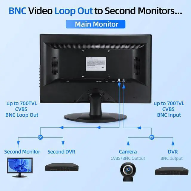 BNC Connection: Experience unparalleled visual clarity on our 18.5 -inch security monitor, designed specifically for CCTV systems. With BNC connectivity, enjoy a reliable and seamless connection, ensuring optimal image quality and smooth monitoring. ^^ Effortless Integration with Multiple