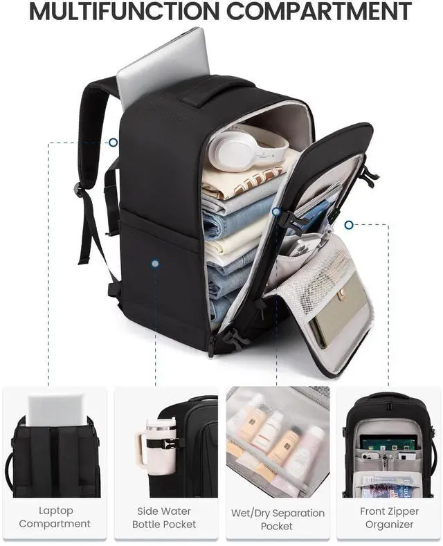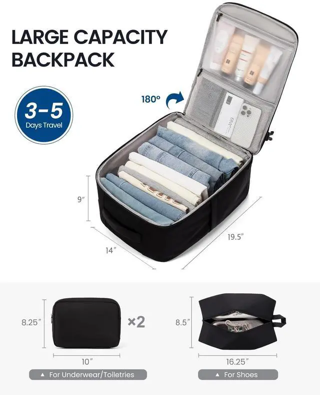 Perfect for 3-5 Days TravelYou'll receive a high-capacity travel backpack( 19.5" 14"9") plus 3 bonus packing cubesperfect for storing essentials for 3-5 days of travel, with space equivalent to a 22-inch suitcase. ^^ 180 Open DesignThe 180-degree full-open design lets you grab/pack your stuff in seconds and breeze through TSA like a pro. Good choice of personal item travel bag. ^^ TSA FriendlyThis personal item backpack fits perfectly under seat or in the overhead binmeets all major U. S. airlines' carry-on requirements! And the dedicated back-panel laptop compartment lets you quickly access your laptopperfect for airport security or on-the-go use.