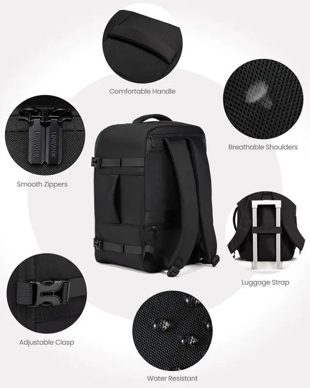 ^^ Well OrganizedThe personal item backpack features 13 pockets for efficient organization. The dedicated laptop sleeve fits up to 18 inch laptop, and the built-in wet/dry separation pocket stores damp towels. And it also has a back anti-theft Pocket for valuables, a side pocket for water bottle. ^^ Easy to CarryThe suitcase backpack is comfortable to carry with thick padded shoulder straps and back pading. With two handles on the top and right side and luggage strap provides you with a more flexible carrying experience. ^^ Water-resistant & DurableMade from water-resistant fabric, It keeps items dry when used in rainy day.