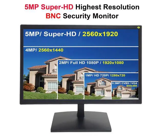 ^^ 2. Keeps video looking its best by preventing blurry or pixelated images. Preserve original high video quality without artifacts, signal loss, or distortion caused by digital processing and compression through a Digital Video Recorder or Distributor. ^^ 3. Super HD 5MP security monitors with BNC inputs allows them to be connected directly to the new super HD up to 5MP/2592x1944 resolution cameras for the much clear and more accurate video feed. And it is 10 times higher than the Standard Definition ( 0.46MP /960H, 0.3MP /CVBS or VGA) BNC resolution from Normal CCTV/security monitors.