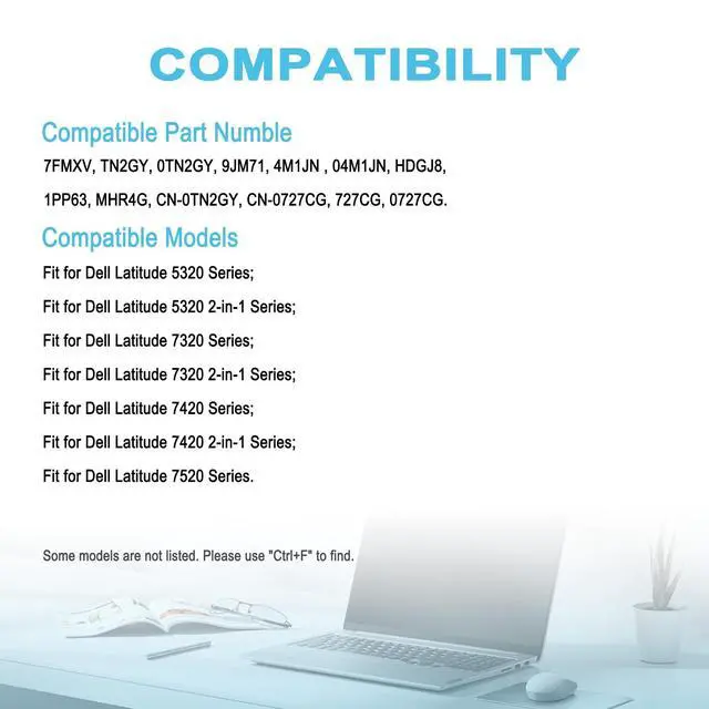 Condition: 100% brand new from manufacturer. ^^ Replacement Battery Part Numbers7FMXV, TN2GY, 0TN2GY, 9JM71, 4M1JN, 04M1JN, HDGJ8, 1PP63, MHR4G, CN-0TN2GY, CN-0727CG, 727CG, 0727CG. ^^ Compatible ModelFit for Dell Latitude 5320 Series; Fit for Dell Latitude 5320 2-in-1 Series; Fit for Dell Latitude 7320 Series; Fit for Dell Latitude 7320 2-in-1 Series; Fit for Dell Latitude 7420 Series; Fit for Dell Latitude 7420 2-in-1 Series; Fit for Dell Latitude 7520 Series. ^^ Security/QualityAll batteries are UL, CE, FCC, RoHS safety certification, built-in over charge, over discharge, over temperature, short circuit protection. The battery offers up to 1000 charge cycles and uses grade A battery cells to improve charging speed and battery performance, ensuring performance and durability. ^^ After-Sales SupportWe support 30 days refund, 12 months warranty (refund or replace battery), 24 x 7 mail support. return window will close one month after you receive the product and you can contact us by placing your order or by clicking " Ask a question" on the seller's page.