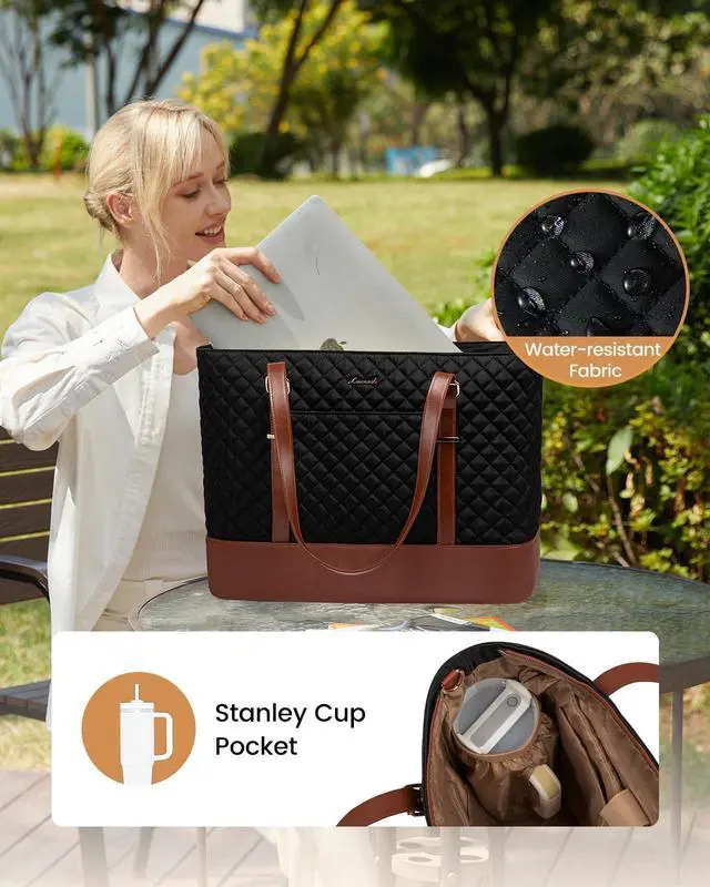 ^^ Stanley Cup Holder: The computer bags for laptops for women features a dedicated pocket specially designed to fit Stanley cups. Carry your favorite beverages securely and in style while on the go.