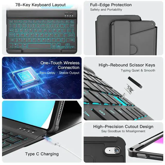 Colors: The magnetic detachable keyboard with 7-color backlight & 3-level brightness adjustment enjoy comfortable typing in any lighting condition. Featuring a row of shortcut keys for instant control, volume and brightness perfect companion for home, office, or travel.