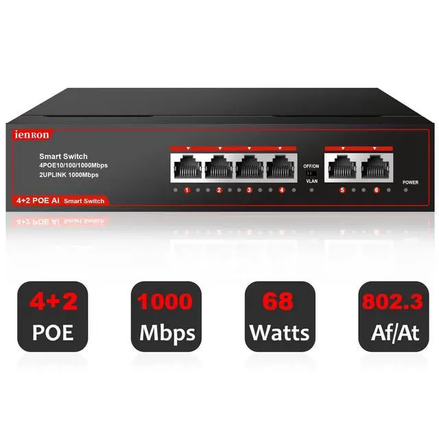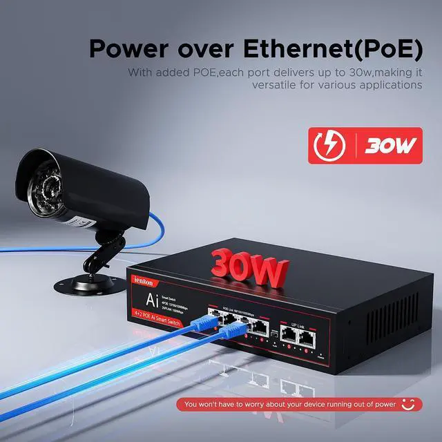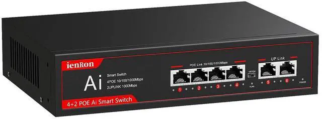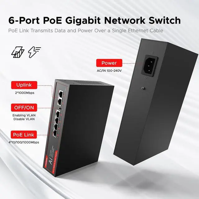 ^^ [AI Detection]: The 6-port PoE switch adopts advanced partial discharge technology. When the PoE device is disconnected or has no response, the PoE port switch will automatically detect the abnormal port connection and restart intelligently to make it work again.