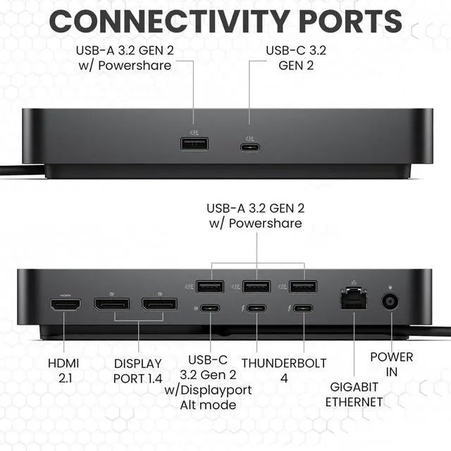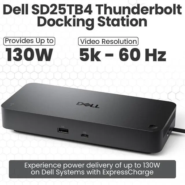 Dell SD25TB4 Docking Station Bundle - High-performing Thunderbolt 4 docking station connects up to 4 monitors @ 4k via HDMI 2.1, DisplayPort 1.4, USB-C and Thunderbolt 4 ports - perfect for creative professionals, data analysts, and productivity enthusiasts who demand maximum screen real estate ^^ Lightning-Fast 180W Charging & 40GB/s Data Transfer - SuperBoost technology delivers rapid 180W power to Dell laptops (130W to others) while maintaining blazing 40GB/s Thunderbolt 4 data speeds. This thunderbolt docking station eliminates cable clutter and powers your entire setup with a single connection ^^ Premium Connectivity Hub - 2x Thunderbolt 4 ports, 1x USB-C 3.2 Gen 2, 3 x USB-A 3.2 Gen 1 with PowerShare, 2 x DisplayPort 1.4, 1 x HDMI 2.0, 1 x USB-C Multifunction DisplayPort, 1 x Gigabit Ethernet RJ45 Port ^^ Universal Dell Docking Station - Works seamlessly with Windows 10/11, macOS, and Ubuntu systems while featuring 65% recycled plastic construction and 100% recycled packaging - Use it with your Dell Laptop, Lenovo Mac m4 and more ^^ Business-Grade Security & Remote Management - Advanced WPA3 encryption, PXE boot capability, MAC filtering, DMA protection, plus remote Wi-Fi management via Dell Console and Intel AMT - enterprise-level security without compromising performance ^^ Inside the Package - 1x Dell Thunderbolt 4 Docking Station SD25TB4, 1x HDMI cable, 1x Thunderbolt 4 cable, 1x Displayport cable, 1x Cat6 Ethernet cable, 1x microfiber cleaning cloth, 1x 180w power adapter