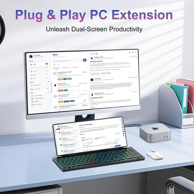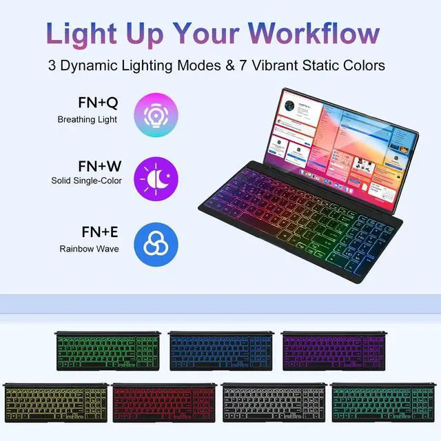 MUST NOTE: If the screen shows No Signal, please check driver installation as instructed in the manual. ^^ Customizable RGB Backlight & CNC Aluminum BuildEnhance productivity in any lighting condition. The keyboard offers 7 single-color modes and a dynamic rainbow mode (controlled via FN+ESC/2/8). Housed in a premium CNC aluminum body, this small portable monitor is as durable as it is sleek, offering a professional look and feel. ^^ 10-Point Touch Interactive DisplayGo beyond typing with the responsive 10-point touch screen. This touch screen keyboard combo allows for intuitive control, whether scrolling through documents, zooming into designs, or using touch-enabled apps, making your portable monitor extender for laptop vastly more interactive. ^^ Whisper-Quiet Office Keyboard Under 30dBDesigned for focused work environments, our portable monitor with keyboard features a precise scissor-switch mechanism. With typing noise below 30dB, it provides a stable, laptop-like typing experience that is significantly quieter and more durable than standard membrane keyboards, making it the ideal portable monitor for laptop extensions in libraries, offices, or coffee shops. ^^ 180 Flexibility & Ultra-Portable Design This 12.8" portable monitor is engineered for adaptability.