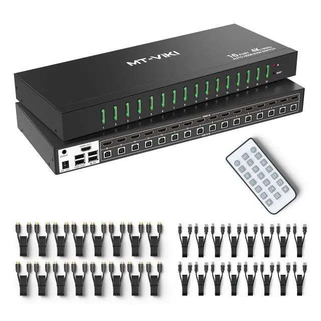 HDMI KVM Switch: MT-VIKI 16 port HDMI KVM switch allows you to manage up to 16 computers by 1 set of monitor, keyboard and mouse. Resolution up to 4K@60Hz and is compatible with HDCP 2.0. Simple installation, HD display, and stable operation.
