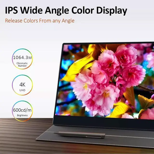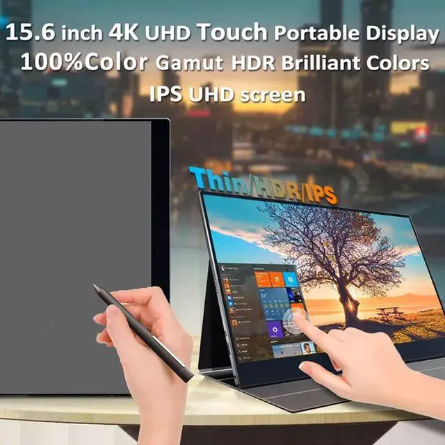 4K UHD DisplayThis 15.6 -inch 4K usb-c hd monitor delivers 840x2160 resolution with 107 llion 10-bit colors. With 100 percent DCIP3 color area, 600 nits of brightness, and support for HDR 4001500:1 contrast ratio, it delivers a bright, colorful, and immersive visual experience. Turn on HDR and FreeSync mode for stunningly realistic images with low latency when watching movies or gaming ^^ Powerful FunctionsSupport 4096 pressure sensitive, 10 point capacitive, achieve multigesture touch. Built in 10000mAh lithium battery, uninterrupted work can be up to 45 hours. ^^ Rich InterfacesThe laptop portable monitor comes with 1 x HD, 1 x C-Port (for video data transfer); 1 x C-Port (for power); 1 x Headphone Port ( 3.5 mm); 1 x cro USB Port (for connecting a keyboard and a mouse, compatible with a wide range of HD and c-type devices such as smartphones, laptops, PCs and mobile devices ^^ Portable and Traveling at All TimesFeaturing an ultra-thin bezel that creates a seamless picture and smooth matte finish, the 15.6 -inch 4k travel monitor for laptop is designed to be so compact and portable that it easily fits in your backpack or suitcase whenever you're on the, making your monitor ideal for work, play or study.