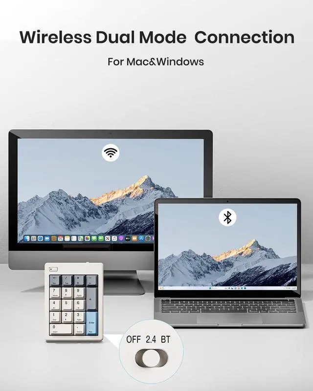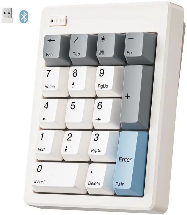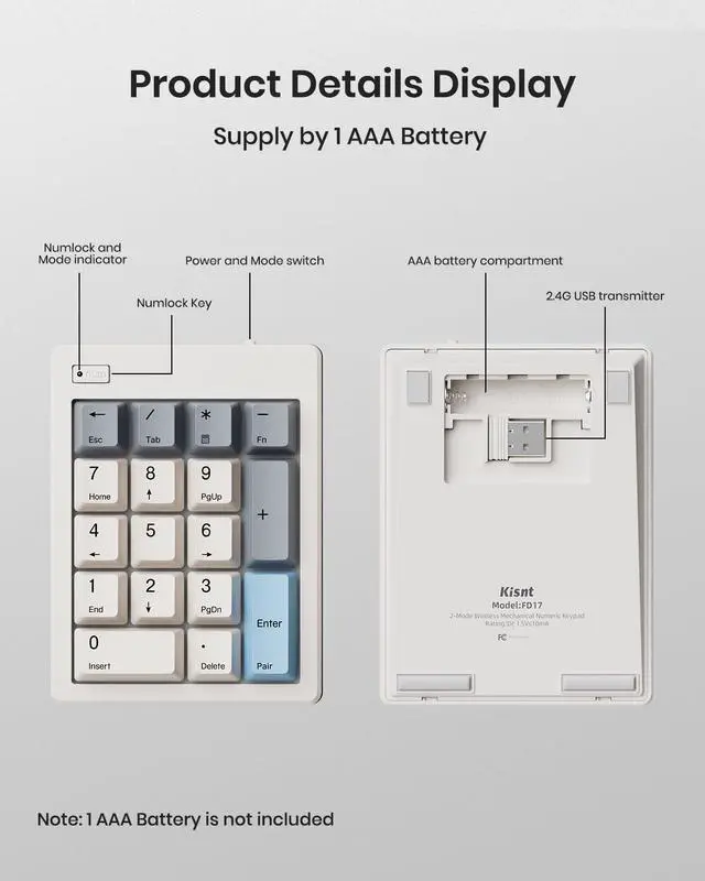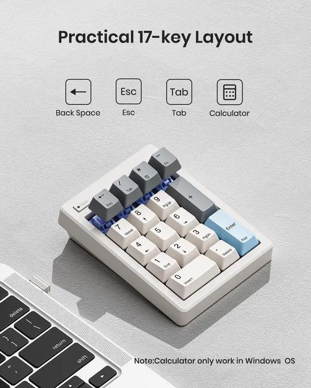 FD17 dual-mode connection: Bluetooth 5.0 and 2.4G wireless, allowing you to seamlessly switch between computers, laptops, MacBooks, iPads, tablets or smartphones. Powered by 1x AAA battery (NOT INCLUDED), stays cord-free and portable, simply replace the battery when low. With auto-sleep mode (press any key to wake up) for extended battery life. ^^ 17 Keys Practical LayoutCompare to standard keypads, this bluetooth numpad extended enhanced independent Backspace and convenient shortcuts for ESC, Tab, Calculator. Complete numeric workspace- calculate, navigate, correct, and exit all from one device. Compact and space-saving ( 3.6 x 4.8 x 1.6 inches), perfect for office use and on-the-go professionals. Whether youre working for spreadsheets, data entry, or accounting tasks, its got you covered with minimal latency. ^^ Widely ApplicationThe wireless number pad works with almost all operating systems including Windows, Mac, IOS, Linux, Android. It can be placed right beside your gaming keyboard on your desk, also conveniently on the left-hand side and stored in a drawer when not in use.