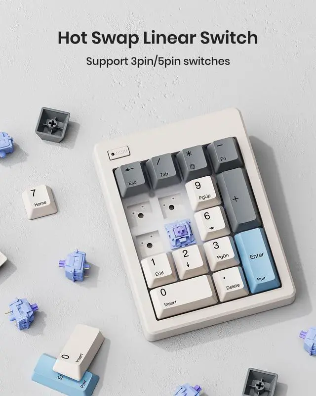 (NOTE: The 10 key is not compatible with Chrome OS and has limited functionality with Mac OS, as Apple systems do not support external function keys. ) ^^ Hot-Swappable& PBT Dye-Sub KeycapsYou can easily hot-swap the mechanical numpad with almost of the 3 pin and 5 pin switches on the market. The durable PBT keycaps offer higher quality than ABS, more wear-resistant and long-lasting in texture. If you appreciate quality mechanical keyboards, youll love the refined feel this ten key makes. ^^ Gasket Mounted& Smooth Linear SwitchesWith its gasket-mounted design, five layers of sound-dampening foam, and silicone plate dampener, it delivers a "creamy" typing sound. Equipped with the pre-lubed Bsun linear switches(45-50gf actuation), ensures a consistent keystroke without tactile bumps or audible clicks. ^^ Warm TipsThe Kisnt FD17 number keypad features no backlight and cannot be programmed. It is recommended to use the 2.4G mode for Windows 7 or earlier versions. Bluetooth connectivity is only compatible with Windows 8 and above, Mac OS 10.10 or later. ^^ 2 Years After-Sales ServiceAny quality issues in 2 years? A new one on us. Every quality refinement runs through our research, development, production, marketing, and sales processes.