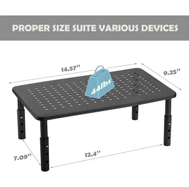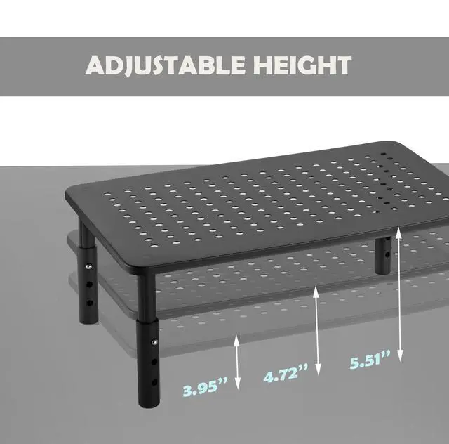 Excellent monitor riser: This computer monitor stand riser Super has durable steel construction with non-skid rubber underneath for a flawless experienceand, can hold up to 44 pounds of downward pressure. Safe design, 3 adjustable ergonomic height sets at 4.13 / 4.92 / 5.7 for desk, pc, laptop, tv.