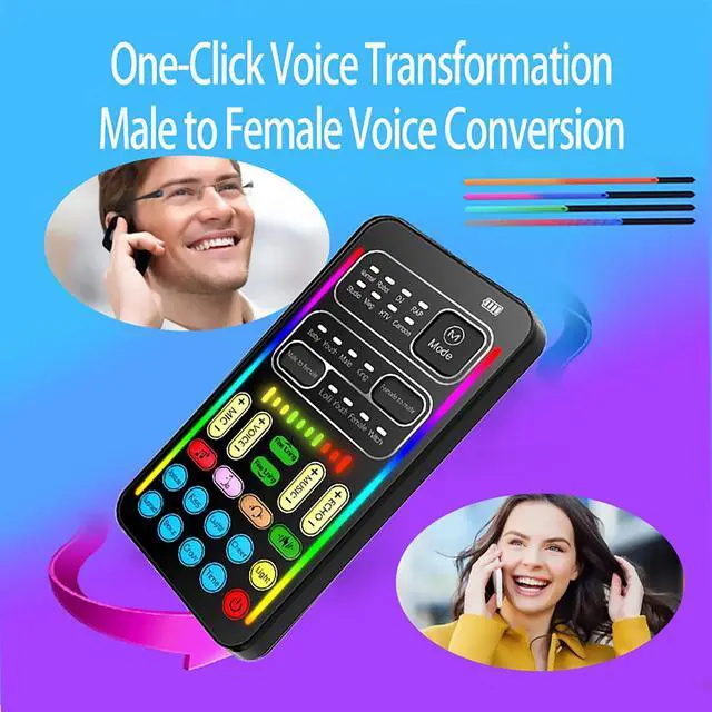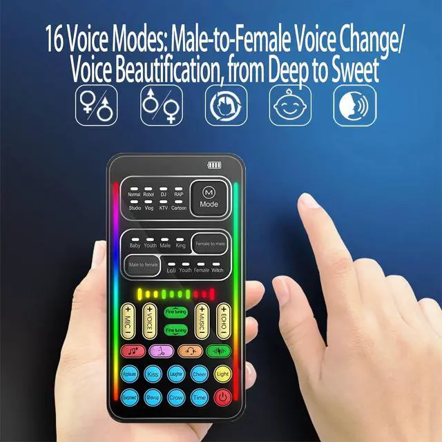 Product Features: The product has comprehensive sound card functionality as well as voice-changing capabilities. The voice-changing function includes eight effects such as male voice, female voice, cute voice, and funny voice, each with ten adjustment levels. The sound card function also includes eight built-in sound modes, an electronic music function (with 10-level pitch adjustment), eight commonly used fixed background special effect sounds, four sound control plus three special functions (elimination/noise reduction/evading), meeting various usage scenarios, and supporting simultaneous output of three devices, two phones, and one computer.