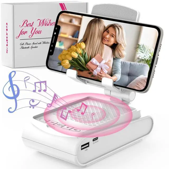Widely Compatible: GLOPUS Bluetooth Speaker with Phone Holder works with most 4-13 devices and securely holds items up to 0.59 thick. Features a USB port for emergency charging. A perfect Christmas gift for momsgreat for music, videos, and keeping connected during the holidays! ^^ Adjustable Angle &