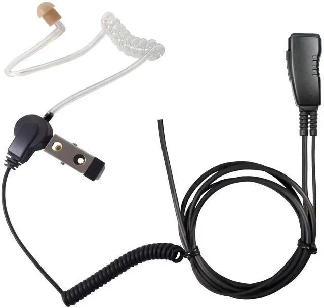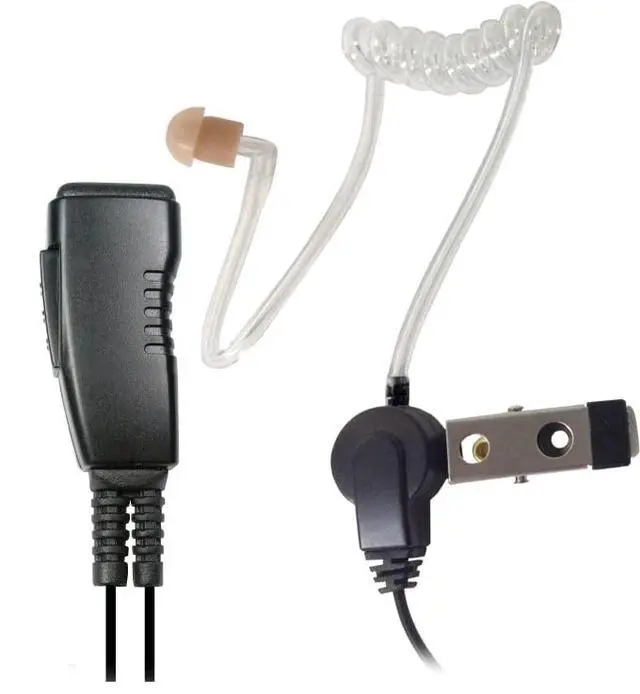 Clear acoustic tube style surveillance earphone made of heavy grade surgical tubing ^^ Comfort fit earpiece can be easily placed for service or hygiene ^^ Clip-on microphone unit includes PTT and stainless steel clip that rotates 360 for easy use ^^ Molded strain reliefs help protect cables from excessive bending and pulling ^^ High quality speaker microphone delivers loud, crisp audio ^^