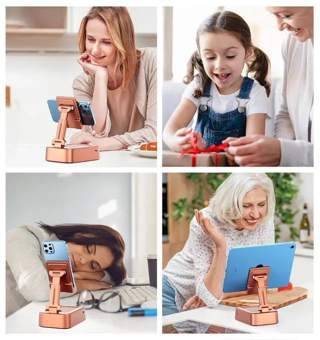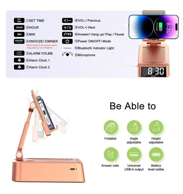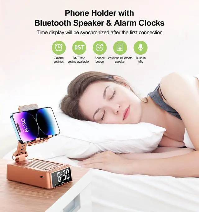 (Please note: it is not a charging stand. ) ^^ 2 Customizable Alarm Clocks with Snooze Mode- Whether it's waking up in the morning or setting reminders for important meetings, our phone holder with separate alarm clocks helps stay on top of your schedule. Short press the snooze button for a 5- minute snap, long press to close alarm. Providing convenience where it's needed most. ^^ LED Display with 3 Brightness and DST Formats- From a dim, calming glow at night to a bright, clear display during the day, it comes with flexibility to customize the screen brightness to your needs. Additionally, the time display is changable with 12/24/DST formats to suit your preferences and location. ^^ 360 Rotable & Angle/Height Adjustable- Allowing for flexible viewing angles, catering to diverse content preferences, such as video calls, multimedia entertainment, and taking showcase videos. Adjustable angle and height reduce eye fatigue and neck pain. A modern gift for Birthday, anniversary, and festival. ^^ [How to Turn Off Alarm Clock or Cancel Alarm Clock ]