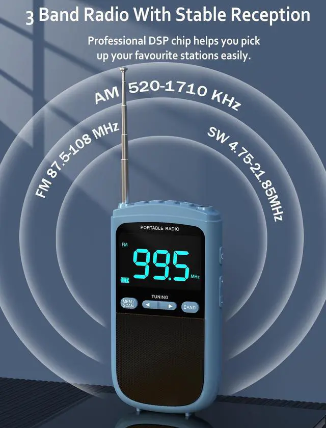 Lock Screen: This portable am fm radio is ergonomically designed for a comfortable grip. This pocket radio is compact and lightweight, the size L 4.14 "x H 2.2" x W 0.79 "fits in pockets and backpacks. The attached wrist strap make this portable am fm radio easy to carry outside. The pocket walkman radio is ideal for outdoor camping, hiking, walking, sports and field work. The portable short wave radio has a lockscreen function to avoid accidentally changing settings.