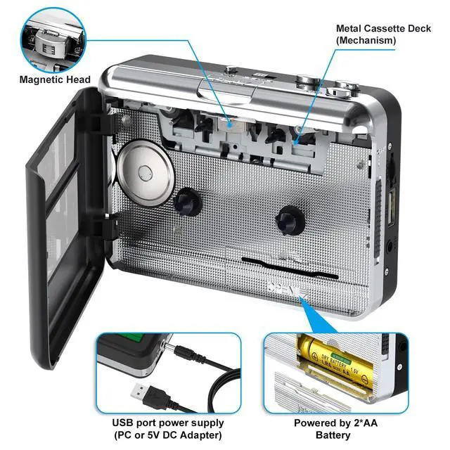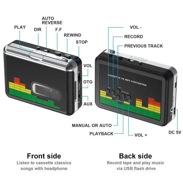 The portable cassette tape player can be converted into MP3 digital files without using a PC, using a USB flash drive to convert MP3 format with one click and save it directly to a USB flash drive. You just put the tape in and play, press the record button and wait. After all songs are played, it automatically saves the audio on the tape side as an mp3 file on a USB flash drive. There will be separate files for song tapes. It has automatically split songs. Then you just have to turn the tape back and do the same thing and record the song on the other side to your USB stick.