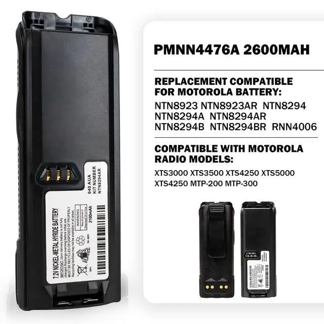 Standard compatibility: NTN8923, NTN8923AR, NTN8294, NTN8294A, NTN8294AR, NTN8294B, NTN8294BR, RNN4006 Two-Way battery can perfectly replace the original battery and has a larger capacity, Work with Motorola XTS3000 XTS3500 XTS4250 XTS5000 XTS4250 MTP-200 MTP-300. ^^ Safety protectionOver-charge, over-discharge, over-heat, over-current and short-circuit protection.
