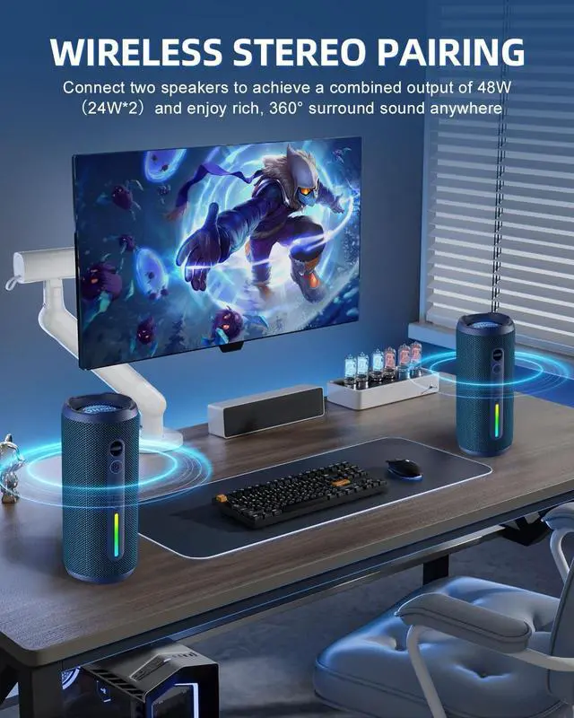 Enjoy up to 24W room-filling sound with punchy bass, strong midranges, and crisp highs. Pair 2 speakers together via Bluetooth to play the same music in perfect sync, double the volume, and create an immersive stereo sound experience. It is your perfect partner for playing games, listening to music and watching movies. ^^ RGB Colorful Light ShowThe wireless LED Bluetooth speakers not only a speaker but also as a unique night theme light, it provide different color-changing themes. Using Ortizan bluetooth speakers, a totally reimagined rainbow light show that pulses, phases, and shines to the beat of your music.