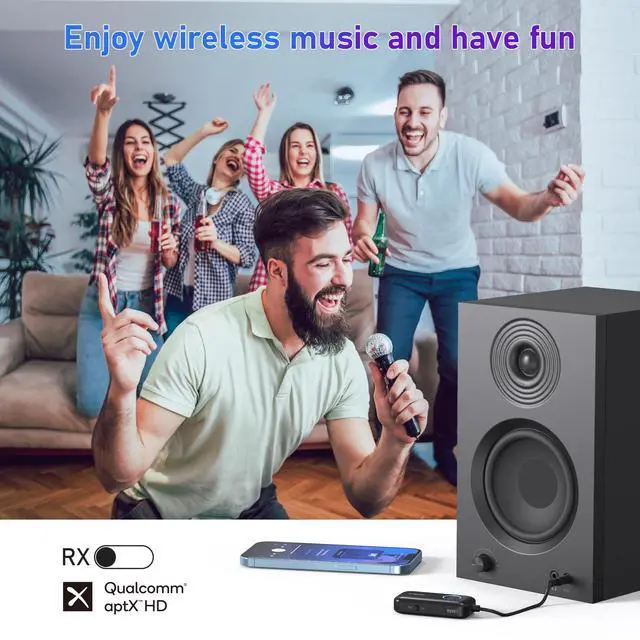 In RX Mode: Turn your wired speakers or car stereo into a Bluetooth-enabled system by connecting to the audio input and pairing with your smartphone. Perfect for modernizing your favorite old stereo setups. ^^ TX Support aptX-LL Low-Latency In transmitter mode (TX), the B06T2 supports aptX-LL Low Latency decoding, achieving an impressive delay of under 36ms. This ensures audio stays perfectly synced with on-screen actionso youll never notice lag between lip movement and sound again. Simply press the power button to switch decoding modes, each indicated by a distinct LED color.