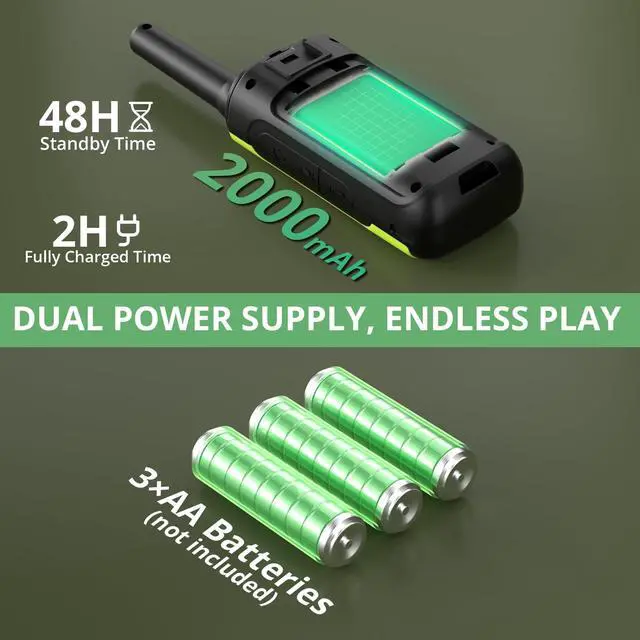 Rechargeable & Long-Lasting Power: Equipped with a 2000mAh rechargeable battery and USB-C fast chargingproviding up to 48 hours of continuous talk time after a full 2-hour charge. Also compatible with 3AA batteries for backup power during road trips or extended outings ^^ Safe, Fun
