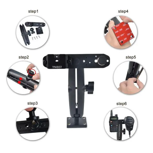 ^^ Stable mountingIt is very stable once installed with included screws and holds your walkie-talkie and microphone firmly. The drill mount base also features adhesive bottom which helps to maximize stability. ^^ Quick InstallationIt only takes a few minutes to install it and you dont need a professional to help with included installation instructions. ^^ Multi-angle adjustmentIts fully adjustable as it features a joint arm socket with a double ball joint head. You can adjust the mount to any convenient viewing angle.