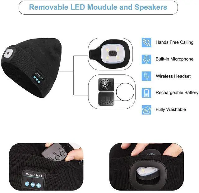 Upgraded Bluetooth Hat with LightKeains upgraded Bluetooth 5.0 wireless technology offer much stable and strong connection, support music and calling, easy and fast to pair with your devices. Maximum transmission distance up to 33 feet. Built-in Stereo Speakers & Mic, enhance your music listening experience. ^^ Long Working Time Music HatBuilt with easy-access USB charging port, simply charge it via the included USB cable. It takes 1-2 hours to get full charged. The battery offers continuous working hours up to 8 hours ^^ LED Headlight Light Up Your WayHands-free LED light is rechargeable and removable.