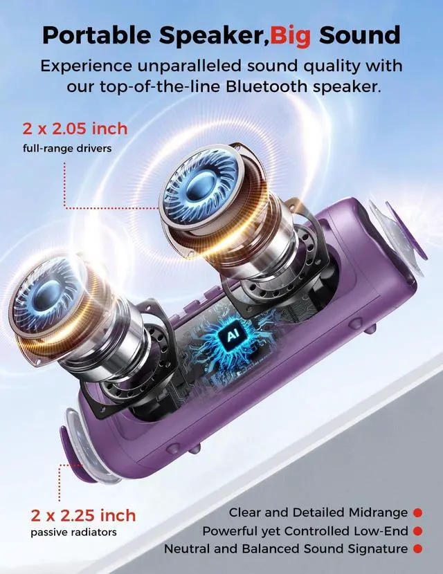 [Immersive Sound Experience & Dual Connectivity] Experience unparalleled sound quality with this wireless Bluetooth speaker's 2 drivers and advanced technology that delivers powerful, well-balanced sound with minimal distortion. Connect two speakers together to create an immersive stereo sound experience and fill any room with powerful sound. Perfect for gaming, music, and movie playback ^^ [Tough & Weather-Resistant] Engineered to handle rough use and adverse weather conditions, this speaker features a durable design and an IPX5 rating for protection against water splashes and spills. It's an ideal choice for outdoor events, and is perfect for use at parties, at the pool, on the beach, while camping or hiking, and more ^^ [Long-lasting Playtime & Extended Bluetooth Connectivity] Experience extended playtime with up to 20 hours(50% Vol and light off) per charge and extended wireless range with Bluetooth 5.3, reaching up to 33 feet from your device.