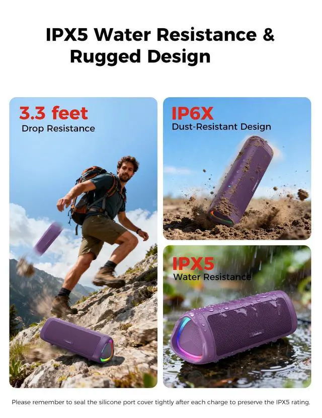 • [Tough & Weather-Resistant] Engineered to handle rough use and adverse weather conditions, this speaker features a durable design and an IPX5 rating for protection against water splashes and spills. It's an ideal choice for outdoor events, and is perfect for use at parties, at the pool, on the beach, while camping or hiking, and more