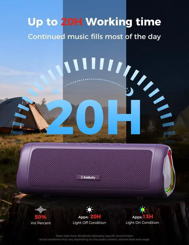 • [Long-lasting Playtime & Extended Bluetooth Connectivity] Experience extended playtime with up to 20 hours(50% Vol and light off) per charge and extended wireless range with Bluetooth 5.3, reaching up to 33 feet from your device. The multicolor lights on the speaker