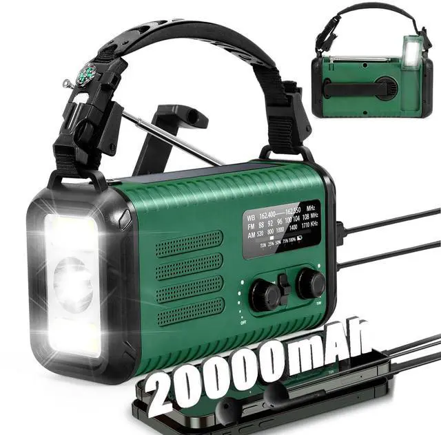 RECHARGEABLE BATTERY AND CHARGE OUTPUT: The solar crank radio with bidirectional USB C interface, can input power for the radio, and also output power for devices. but you can also power the emergency radio via the hand crank and solar panels to ensure that you can use the radio normally in an emergency. No matter what emergency situation you find yourself in, this hand crank radio never run out of electricity! ^^ NOAA EMERGENCY WEATHER BROADCAST ACCESSThe radio will dependably receive 7 NOAA channels for local weather information and emergency hazard alerts. Easily tune into your favorite broadcasts with NOAA( 162.400 - 162.550MHZ ), AM Radio (520-1710 kHz), FM Band ( 87.5MH z-108MHz). allowing you to be prepared and stay safe in the first place before natural disasters such as hurricanes, tornadoes, typhoons, heavy rains, fires, blizzards. ^^ 4 LED TORCH MODES & SOS ALARMThe emergency radio features a powerful A built-in super-bright 4-mode (far beam, low beam, mixed beam and SOS flashing mode) 3W flashlight and 2W reading lamp, which are critical in the event of a power outage. The SOS flashing mode (press and hold for 3 seconds) emits a loud alert and is accompanied by an eye-catching flashing light for emergency assistance.