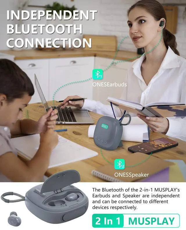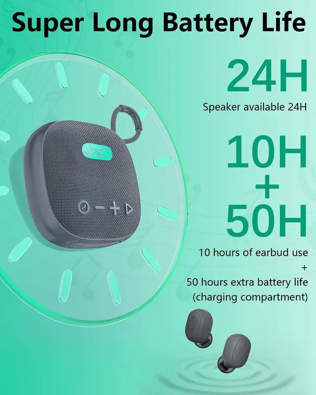 Versatile Portable Design Innovative 2-in-1 device combining a bluetooth wireless Speaker and Earbuds for maximum convenience. 993cm Compact, portable, lightweight construction makes it easy to take your music and calls on the go. ^^ Ultra-Long Battery Life Speaker lasts up to 24 hours, earphones up to 10 hours. Charging case provides 50 extra hours for earphones, totaling 60 hours. ^^ Smart Multifunctional The wireless speaker and wireless earbuds can be connected to separate devices. Speaker supports Bluetooth wireless, AUX wired input, FM radio ( Please connect the included AUX/USBC cable as an antenna )