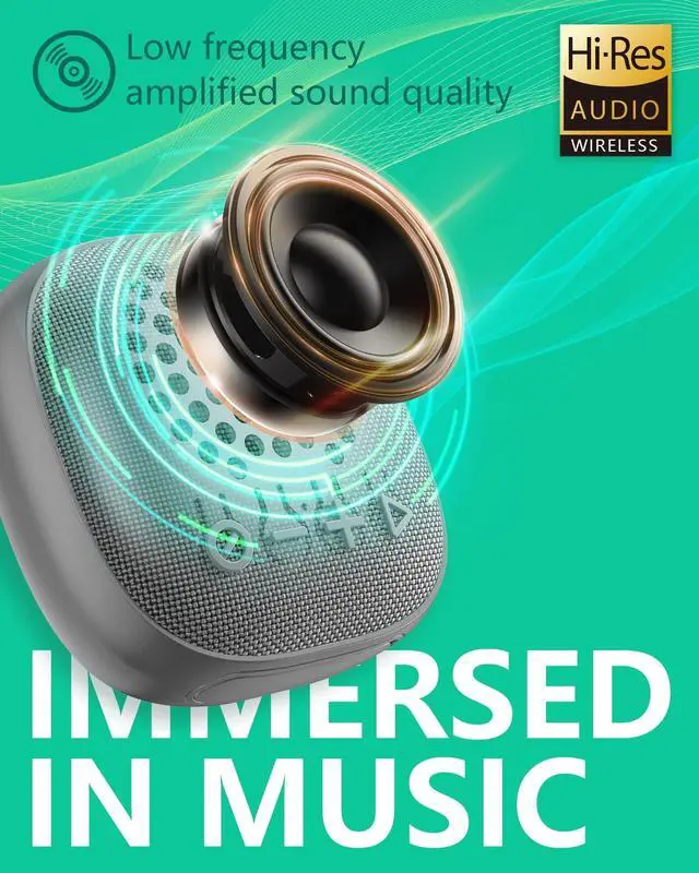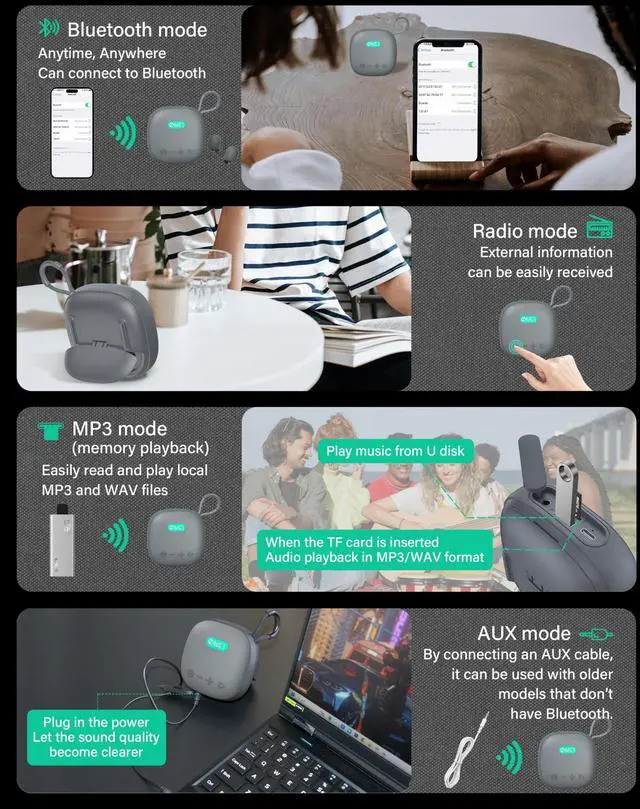 , and MP3 mode ( TF card/U disk memory playback ). Earbuds have music and gaming modes for optimized audio quality and low latency. ^^ Powerful Hi-Res Sound Quality Speaker features a bass amplifier for rich lows, while earbuds have large drivers and balanced EQ tuning for immersive audio. ^^ Stylish Aesthetics Elegant fabric exterior complemented by silicone edging offers a comfortable grip and sophisticated look. The buttons are simple to operate.