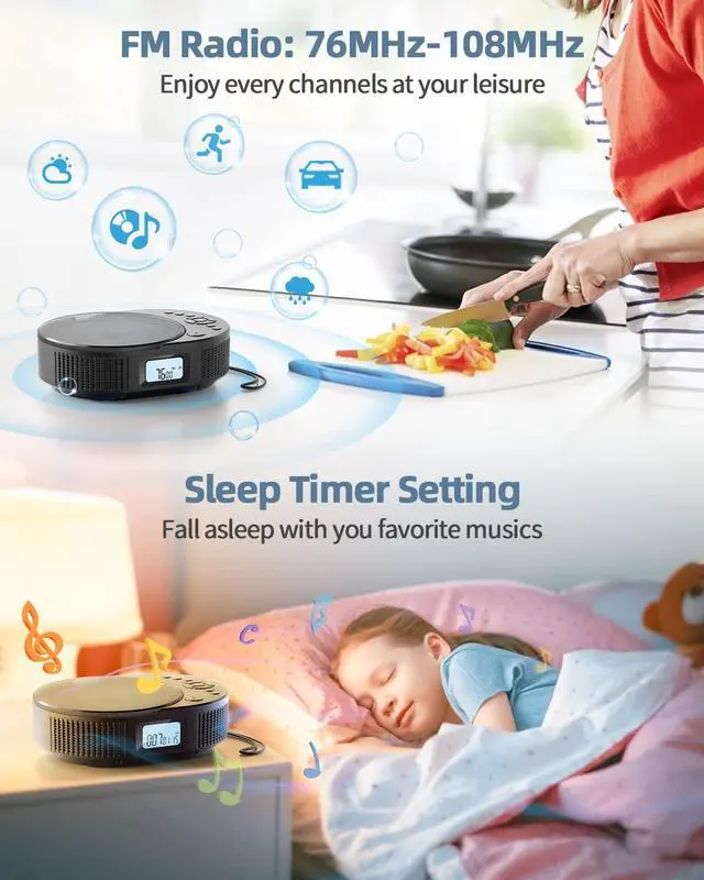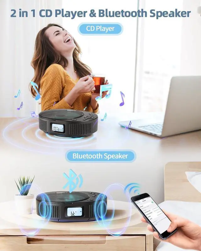 (Note: This cd player bluetooth is not a Bluetooth transmitter, so it can't connect to other Bluetooth speakers or headphones via Bluetooth. ) This personal cd player is compatible with CD, CDR, HDCD, MP3, WMA formats and USB files. ^^ FM Radio & Sleep TimerThe Kpop CD player has built-in FM radio, supports 76MHz-108MHz. Comes with front LED display, you can see the mode and playing time on the screen easily and clearly. A sleep timer function is convenient for you fall asleep with music, just set the shutdown time between 30-120 minutes, no need to wake up to turn it off. Enjoy the cd player wherever in bedroom, living room, kitchen or office. ^^ 100% No-Risk PurchaseLifetime professional customer service & technical support. Please feel free to contact us if you have any problems, we will always help you. What You GetCD Player x1, Remote Control x1, AC Adapter x1, USB to Type-C Charging Cable x1, User Manual x1. ^^ Anti-Skip and Backlit DisplayThe enhanced anti-skip function ensures the cd player boombox won't stop playing with shaking, bumping, or driving on bumpy roads.