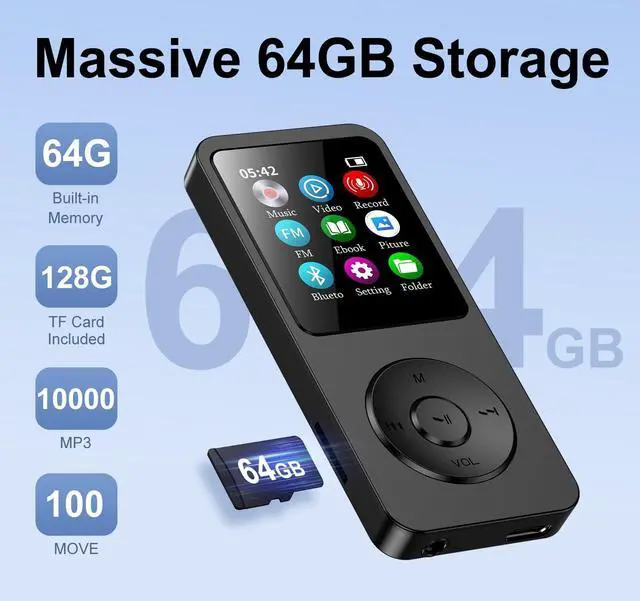 Bluetooth headphones/speakers Note: Phone/tablet connection not supported ^^ 64GB Built-in Memory + Expandable Storage Stores 6, 000+ songs (about 500 albums) Supports 128GB microSD card (card not included) 40hrs playtime + quick 2hr Type-C charging Simple drag-and-drop file management ^^ Ultra-Portable 1.8" Sports Design Fits in any pocket (credit card size) Super lightweight (only
