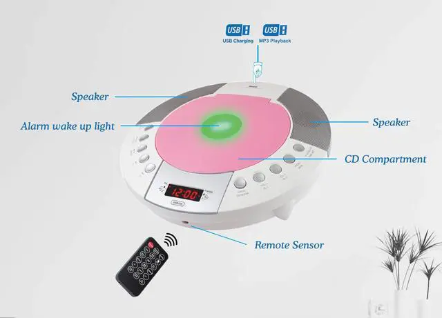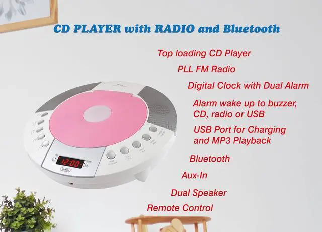 CD Player with PLL FM Radio, Digital Clock with Dual Alarm, Alarm Wake Up to Buzzer, Radio or CD, Red LED Display, Bluetooth, 1 USB Port for 1A Charging and MP3 Playback, Aux-in, Dimmer Function, Memory backup, Remote Control Included.