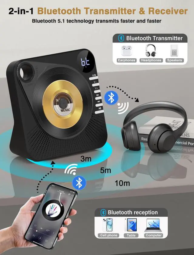 All-in-One Desktop CD Player: Ideal for daily commutes, workouts, or outdoor adventures, this bluetooth CD player supports CD/MP3/CD-R/CD-RW formats and doubles as a USB drive music player. Plug in any 3.5 mm headphone for private listening, or enjoy a USB playback for your favorite playlists. This lightweight, anti-skip design ensures your music stays smooth even during movement.