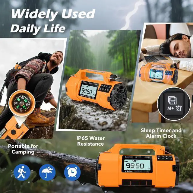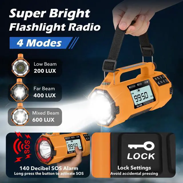 beam: 600 LUX ) and strobe modes, perfect for power outages or wilderness emergencies. During hurricanes or blizzards, visibility is crucial, making it a crucial piece of survival gear for saving lives ^^ Portable solar crank flashlight radio, Outdoor Essential- Solar/Crank NOAA Radio + Compass-Adventure-ready lifesaver! This ultra-portable solar hand crank emergency radio slips into backpacks with its built-in compass for navigation. Perfect for camping, hiking, or emergency kits. Tunes into AM (MW) /FM/SW/NOAA Alert broadcasts anywhere. Supports 2*18650 lithium battery (not incl. ), 3*AA battery (not incl. ), 1*14500 lithium battery (not incl. ) for extended off-grid use. Essential survival gear on the move ^^ All-in-One Emergency Flashlight, Charger, SOS & NOAA Alert Weather Radio-Your ultimate crisis tool! Combines a NOAA emergency weather radio, 5000mAh phone charger, and 3-mode lantern for power outages in one rugged unit. Features drawer-style battery compartment (supports 18650/AA/14500) and hand crank power. Stay connected and illuminated during hurricane, storms, outages, or outdoor emergencies. Also a perfect gifts for family and friends. If you have any questiones about our emergency radios, please kindly let us know then we will provide you a satisfactory after-sales service.