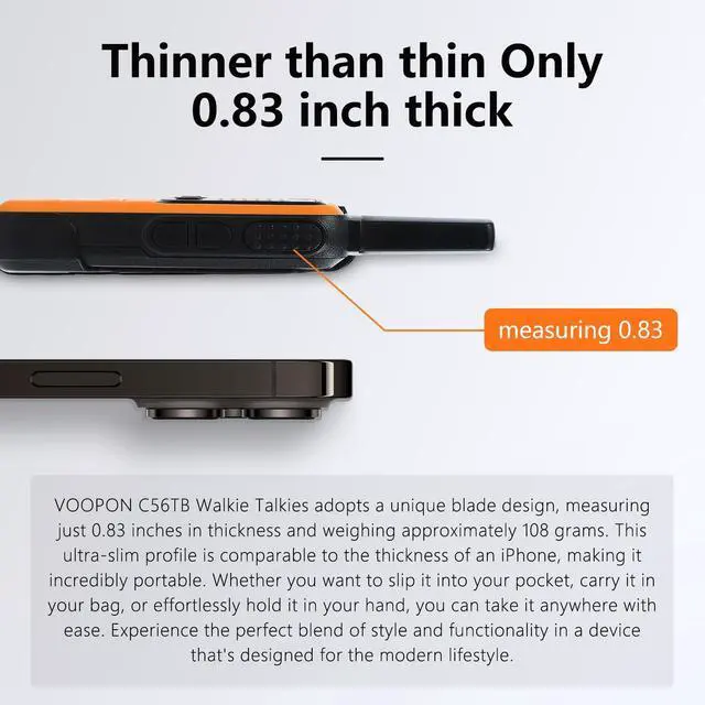 Multiple Channels: Simple to operate. Work right out of the box. 22 FRS channels. These walkie talkies have been preset with privacy codes, ensuring secure and confidential communication. 2 miles transmission distance in open areas or between mountain peaks without any obstruction. 0.5 -1 miles transmission distance in cities. The actual distance Depends on the obstruction of the environment. Affected by FCC regulations on power restrictions and obstacles, most FRS radios are usually within 0.5 -2 miles ^^ Durable and Practical DesignUltra thin blade design, easy to carry. Slip into your porket. Equipped with detachable belt clip. Available in bright yellow and orange colors, these voopon walkie talkies are designed for visibility and safety, making them suitable for use in diverse settings such as outdoor adventures and industrial locations ^^ Convenient Charging OptionsThe voopon C56TB walkie talkies come with TYPE-C USB charging and large rechargeable Lithium battery. With just 4 hours of charging time, enjoy an impressive 96 hours of standby mode and 8-12 hours of continuous usage, plus a low voltage alert to keep you informed.