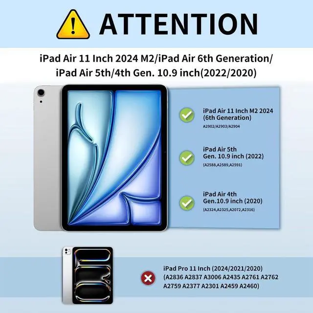 Compatibility Case Only for iPad Air 11 Inch (M3/M2-2025/2024), iPad Air 5th/4th Generation 2022/2020 Not fit other tablet models, please check the model before purchasingMaterial: PU Leather + TPUfor iPad Air 11 Inch M2 2024 Tablet Case with Adjustable StandAllows to set multiple horizontal standing angles for viewing, no angle limitAnti-Slip Design on the Cover Lining Can Help your Tablet Stand Support Stablyfor iPad Air 11 Inch M2 2024Auto